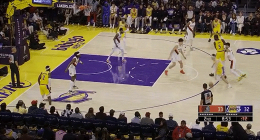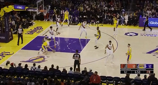 第三节湖人里夫斯拿下9分,开拓者朱-霍勒迪拿下7分,第三节结束湖人77-89落后开拓者